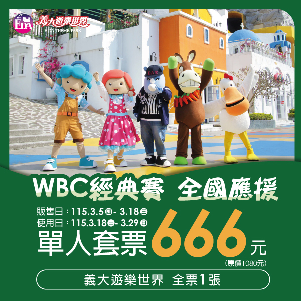 此商品為【義大遊樂世界 WBC經典賽全國應援單人票】活動優惠,恕無法拆售。